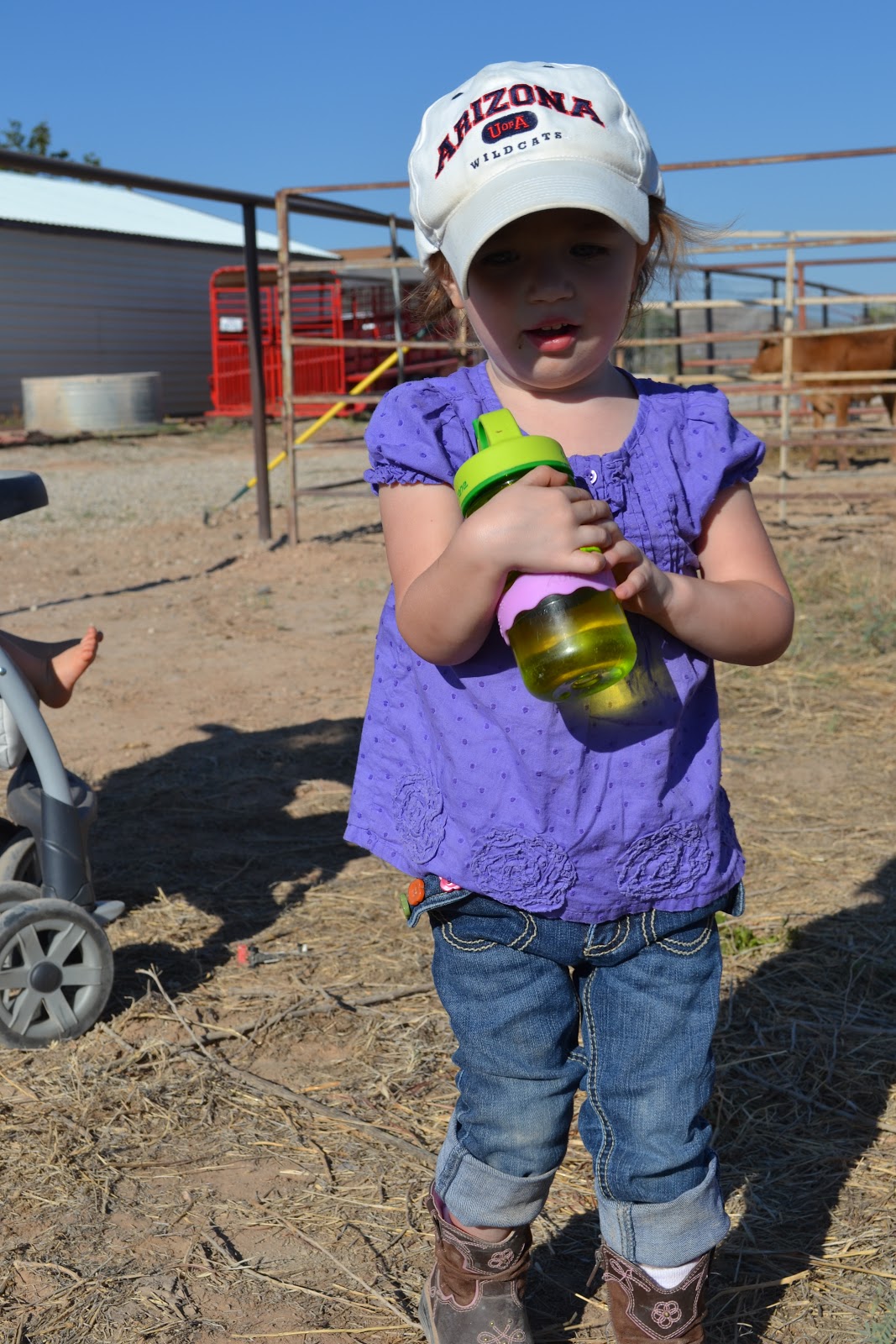 Dad and I roped this afternoon. Duke is still in training and he didn't do too hot today, but he'll get better. He is such a good, gentle horse. He just doesn't know how to chase a cow. And that is fine. He'll get it. Dad wants to train him slowly. Aubrie rode him all by herself (which means on the saddle by herself and I was leading the horse) for 3 laps in the arena to warm him up. She also would not go into the house until she fed Duke his grain. Adam got to witness her tasting the sweet feed. He enjoyed watching her playing in the dirt.